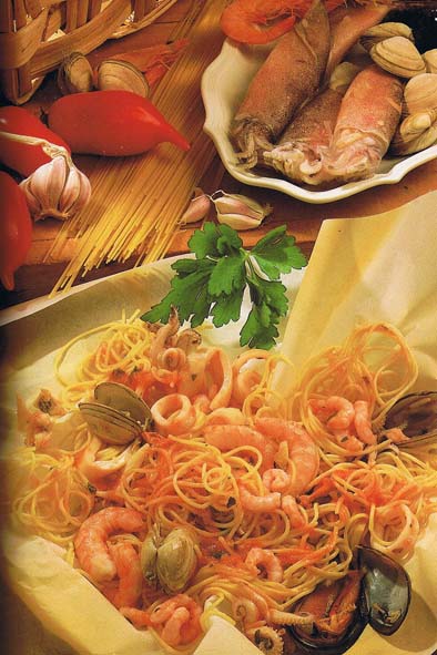 Spaghetti con frutti di шаге a cartoccio
